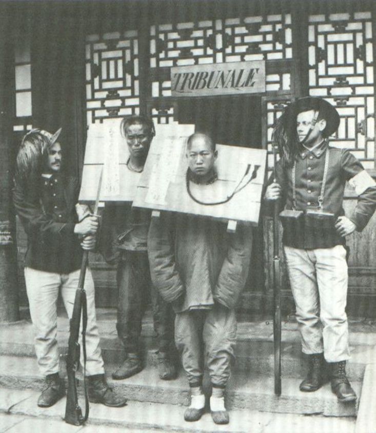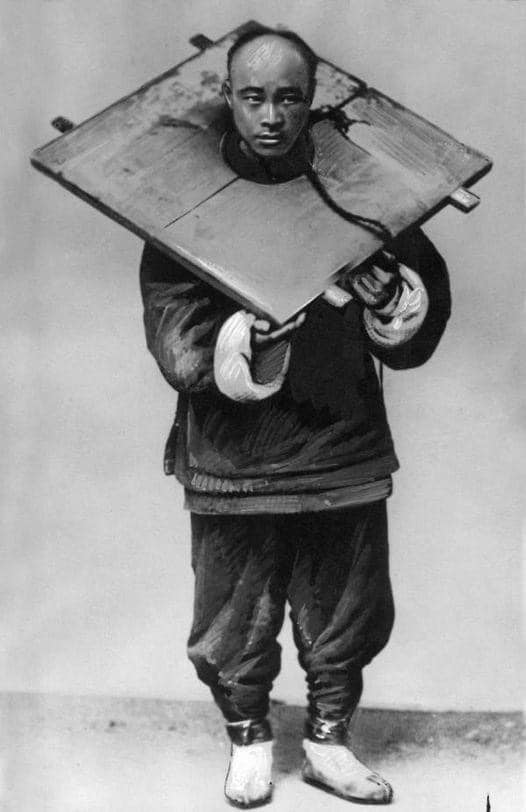 "As from the nature of the cangue it is impossible for the wearer to reach his mouth with his hands, he is dependent absolutely for food and drink upon the kindness of others. Those with neither relatives or friends are in sore danger of dying through exhaustion or starvation." (“A History of Torture” by George Riley Scott)