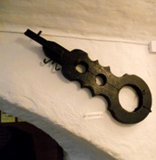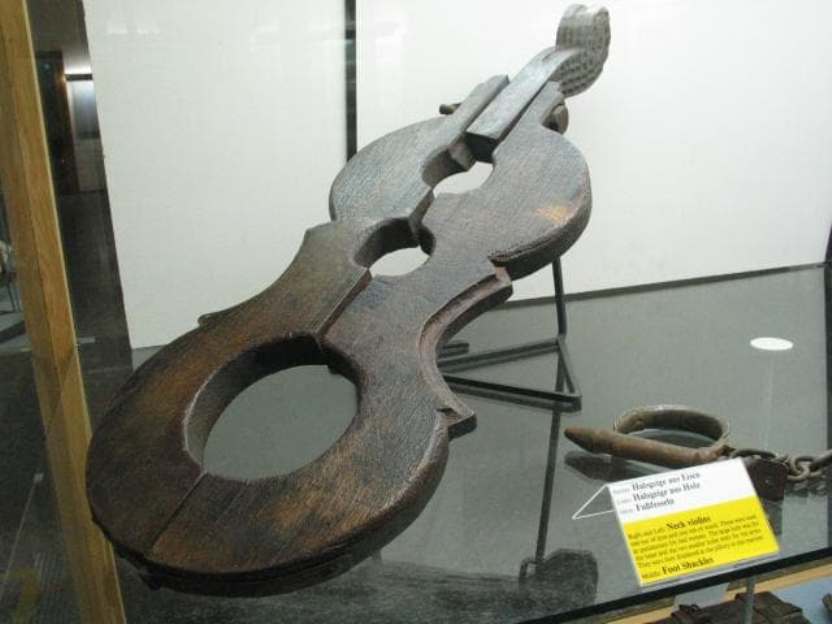 A shrew’s fiddle designed for an individual woman resembled a violin, hence the name. The fiddle would would usually have a chain or a rope attached to the front, so that the unfortunate woman could be paraded through the streets.