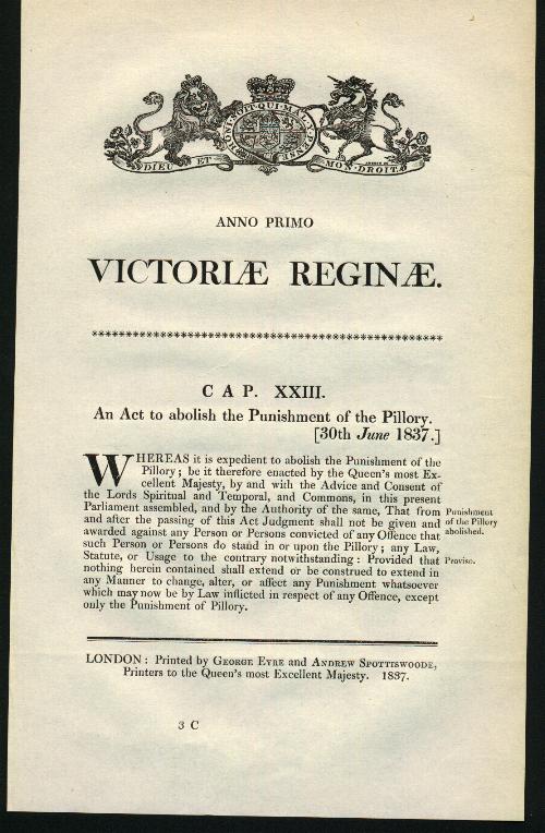 The pillory was not finally abolished in Britain until 1837. Here is a scan of the original