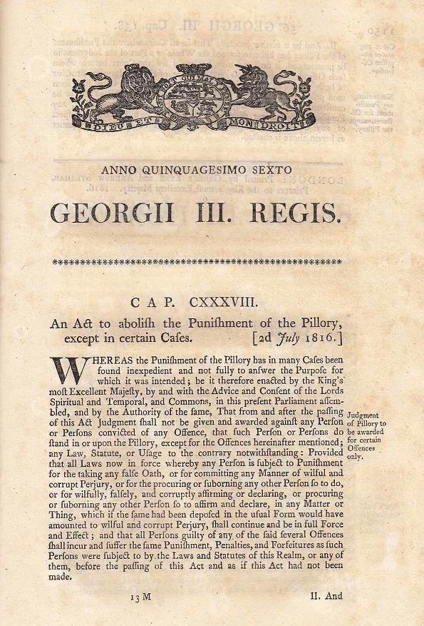 It was not until 1816 that the use of the pillory was restricted to punishing perjurers. Here are extracts from the Parliamentary debates of the Pillory Punishment Abolition Bill. And a scan of the original Act of Parliament.