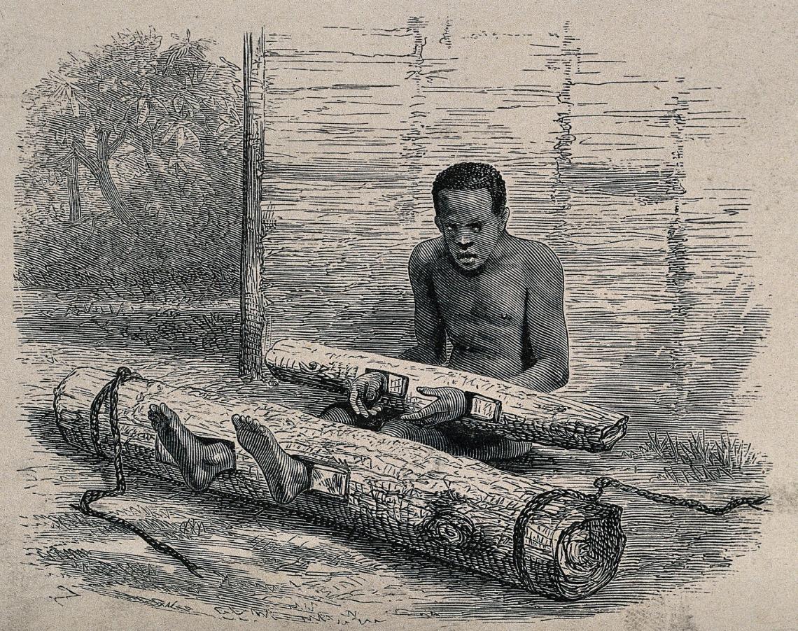 "On the return of his master, some of the slaves were sent for Harry. When he came home he was seized and confined in the stocks. The stocks were built in the barn, and consisted of two heavy pieces of timber, ten or more feet in length, and about seven inches wide; the lower one, on the floor, has a number of holes or places cut in it, for the ankles; the upper piece, being of the same dimensions, is fastened at one end by a hinge, and is brought down after the ankles are placed in the holes, and secured by a clasp and padlock at the other end. In this manner the person is left to sit on the floor. Harry was kept in the stocks day and night for a week, and flogged every morning. After this, he was taken out one morning, a log chain fastened around his neck, the two ends dragging on the ground, and he sent to the field, to do his task with the other slaves. At night he was again put in the stocks, in the morning he was sent to the field in the same manner, and thus dragged out another week."