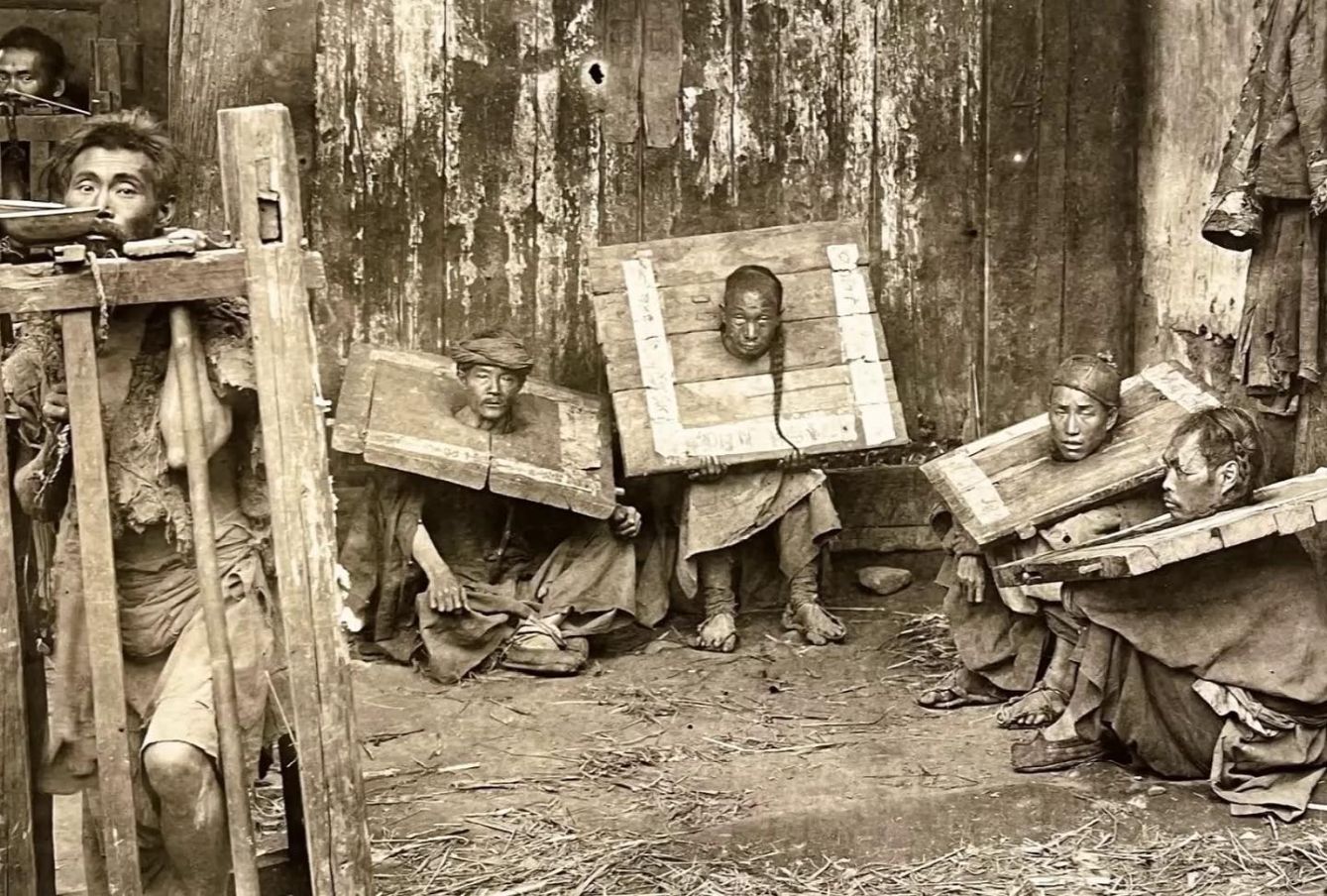 "As from the nature of the cangue it is impossible for the wearer to reach his mouth with his hands, he is dependent absolutely for food and drink upon the kindness of others. Those with neither relatives or friends are in sore danger of dying through exhaustion or starvation." (“A History of Torture” by George Riley Scott)