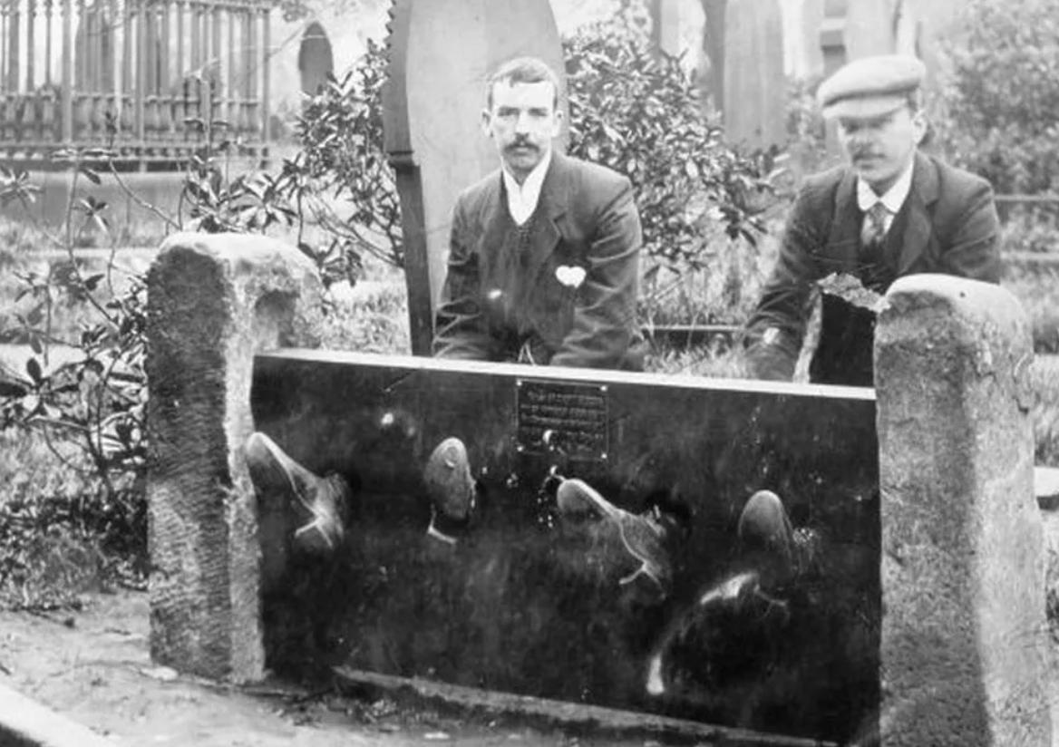 A very old photo, showing the stocks outside Coventry Gaol in 1856.