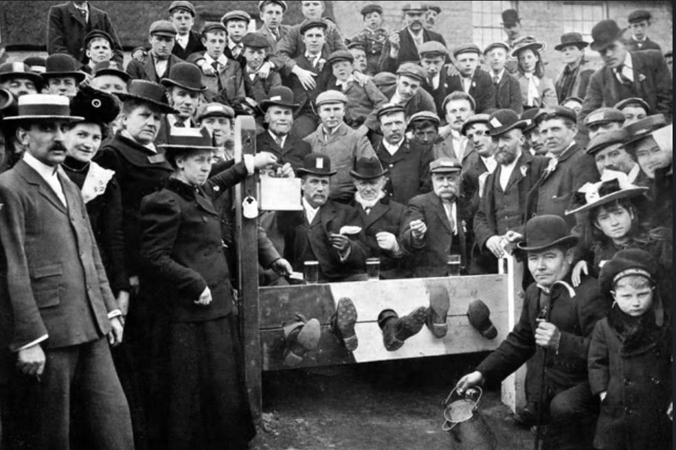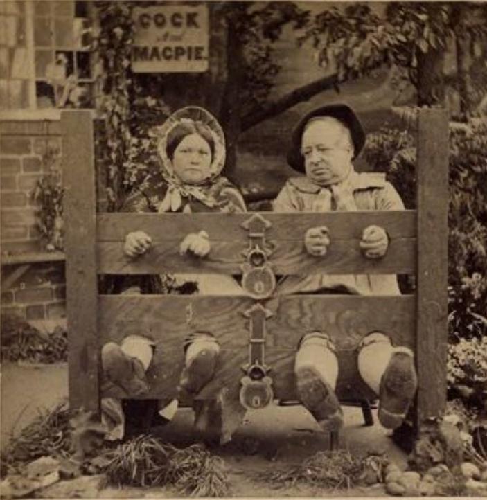 As time went by, this idealism degenerated into sentimentality. The past was seen through rose-tinted spectacles, quaint and amusing. A graphic illustration of this is the Victorians' attitude to the stocks, as portrayed in contemporary photos and drawings. A selection of these images is below.