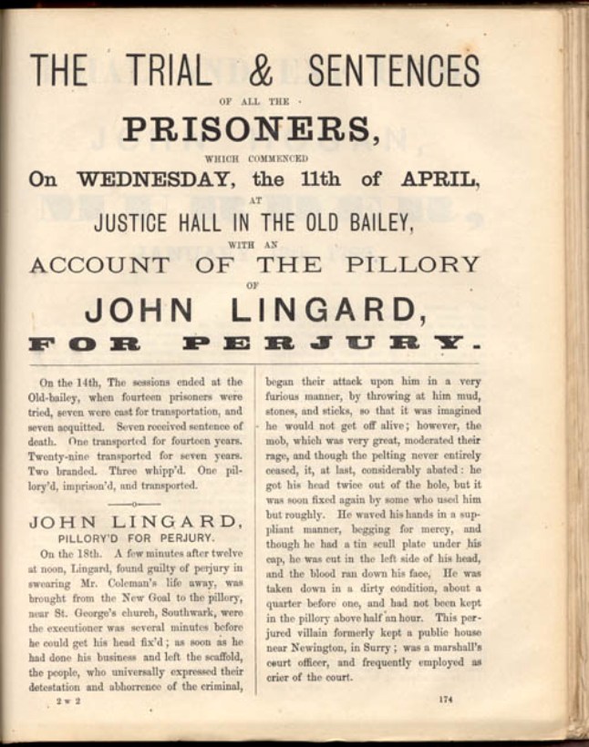 According to the records of the Old Bailey criminal court, on 18 April 1752: “A few minutes after twelve at noon, Lingard, found guilty of perjury in swearing Mr Coleman’s life away, was brought from the New Gaol to the pillory, near St George’s church, Southwark, where the executioner was several minutes before he could get his head fix’d; as soon as he had done his business and left the scaffold, the people, who universally expressed their detestation and abhorrence of the criminal, began their attack upon him in a very furious manner, by throwing at him mud, stones, and sticks, so that it was imagined he would not get off alive; however, the mob, which was very great, moderated their rage, and though the pelting never entirely ceased, it, at last, considerably abated.