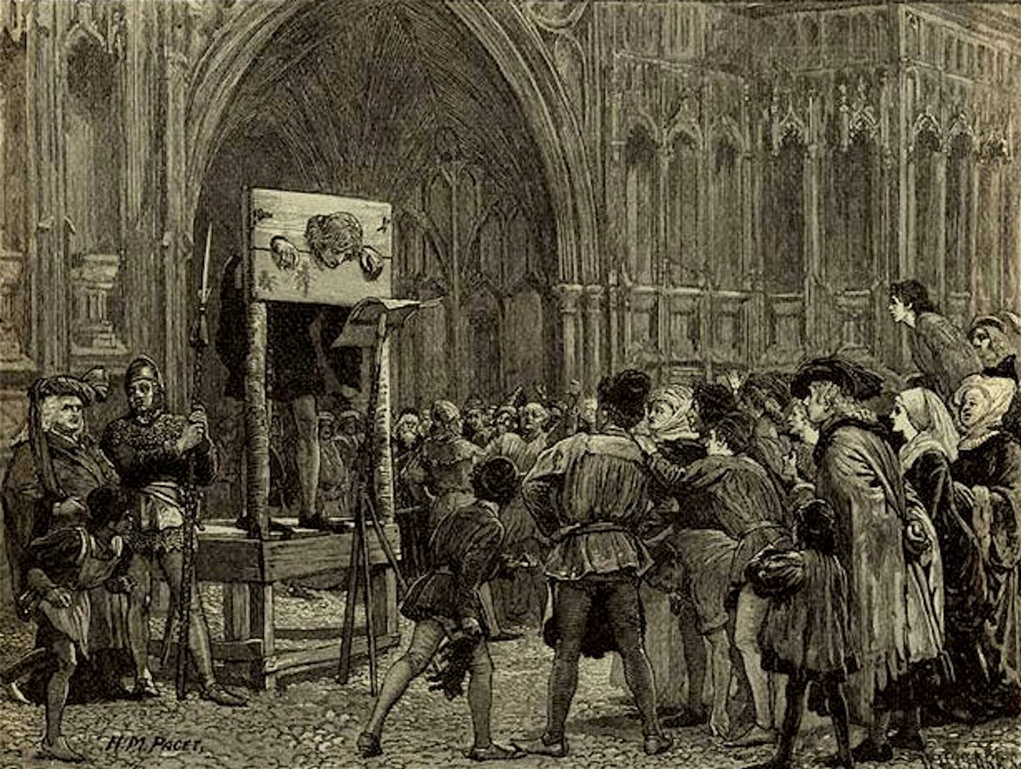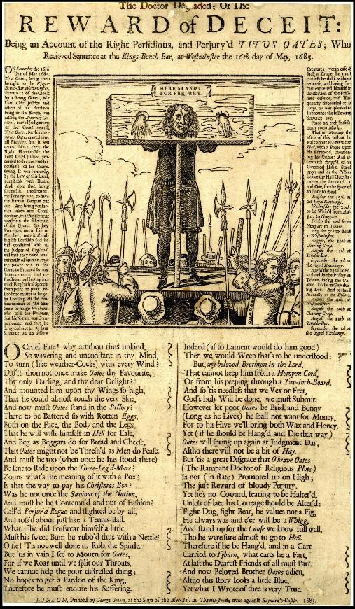 "Found guilty of perjury on two separate indictments, the inventor of the Popish Plot was condemned in 1685 to public exposure [in the pillory] on three consecutive days. The first day's punishment in Palace Yard nearly cost the criminal his life; but his partisans mustered in such force in the city on the succeeding day that they were able to upset the pillory, and nearly succeeded in rescuing their idol from the hands of the authorities.