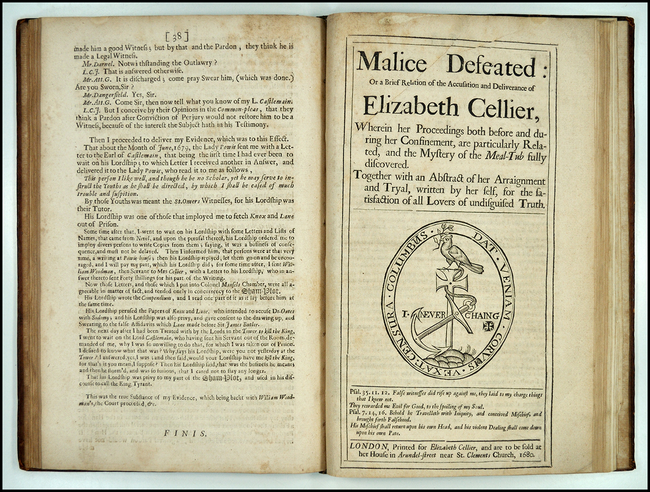 "Mrs. Cellier stood on the pillory at the Maypole today [10 September 1680]. She was much pelted but not hurt."